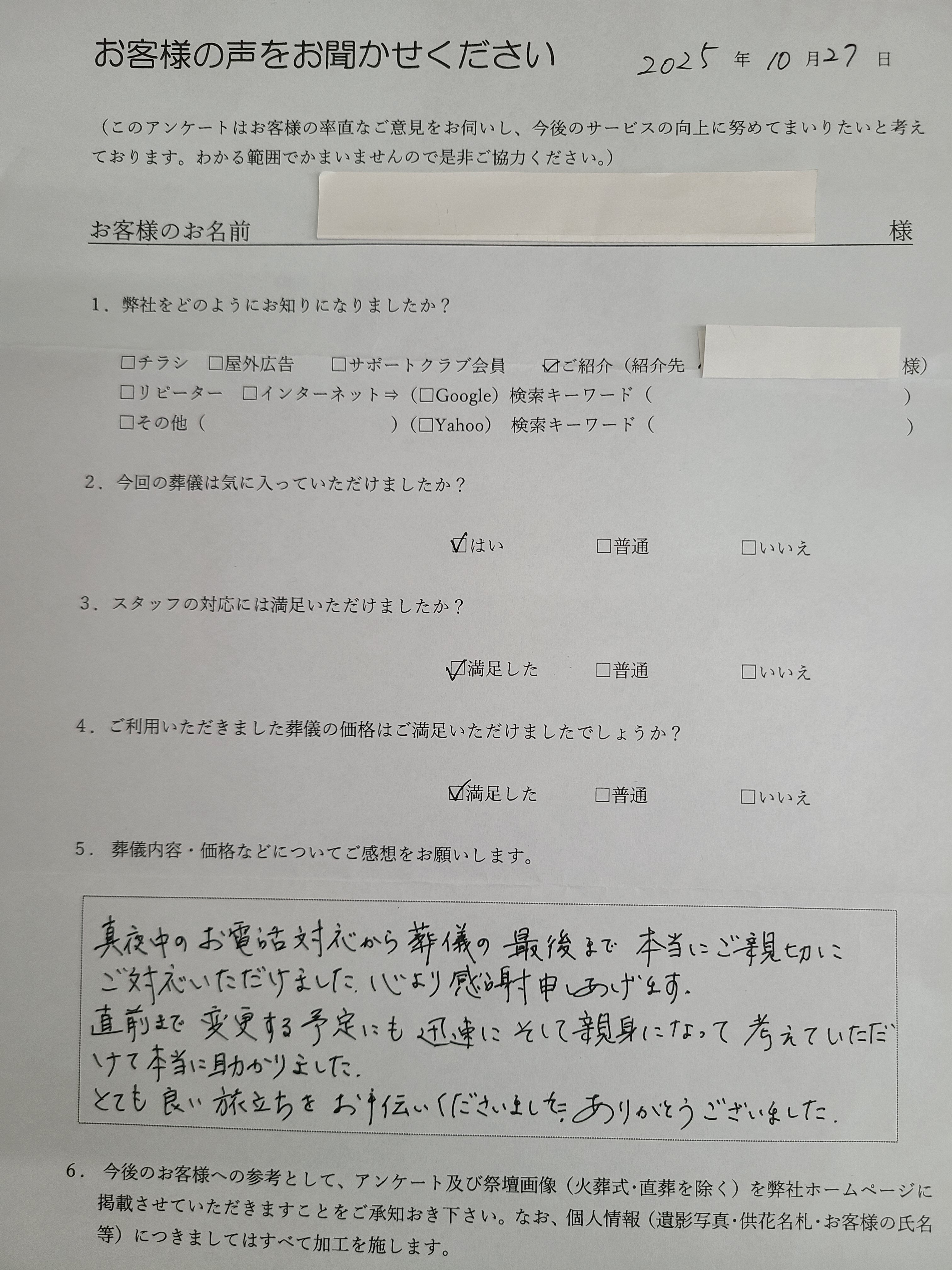 支援葬祭では、葬儀を終えられたご遺族の方にアンケートにご協力いただき、より良いサービスの提供に努めております。