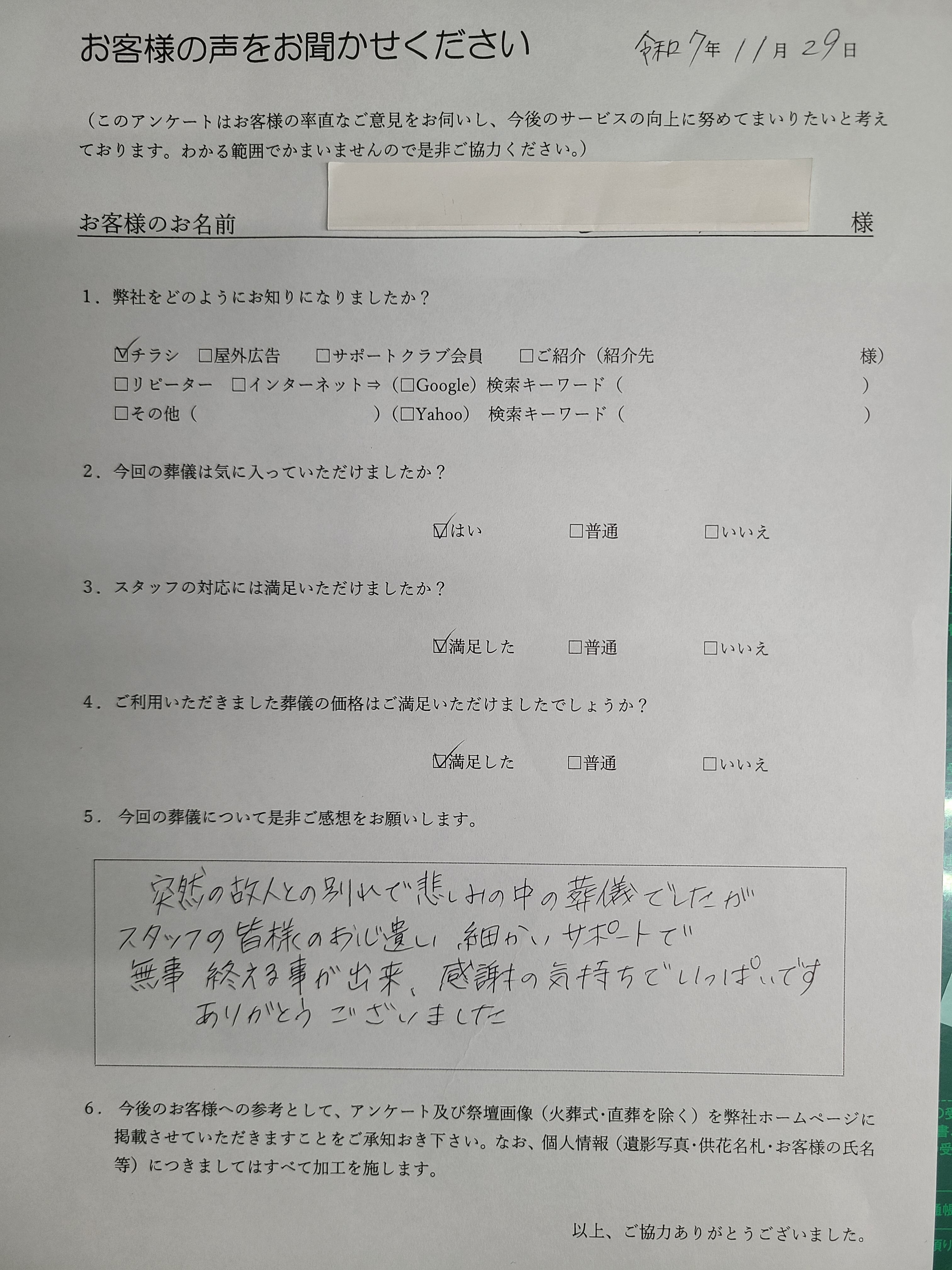 支援葬祭では、葬儀を終えられたご遺族の方にアンケートにご協力いただき、より良いサービスの提供に努めております。