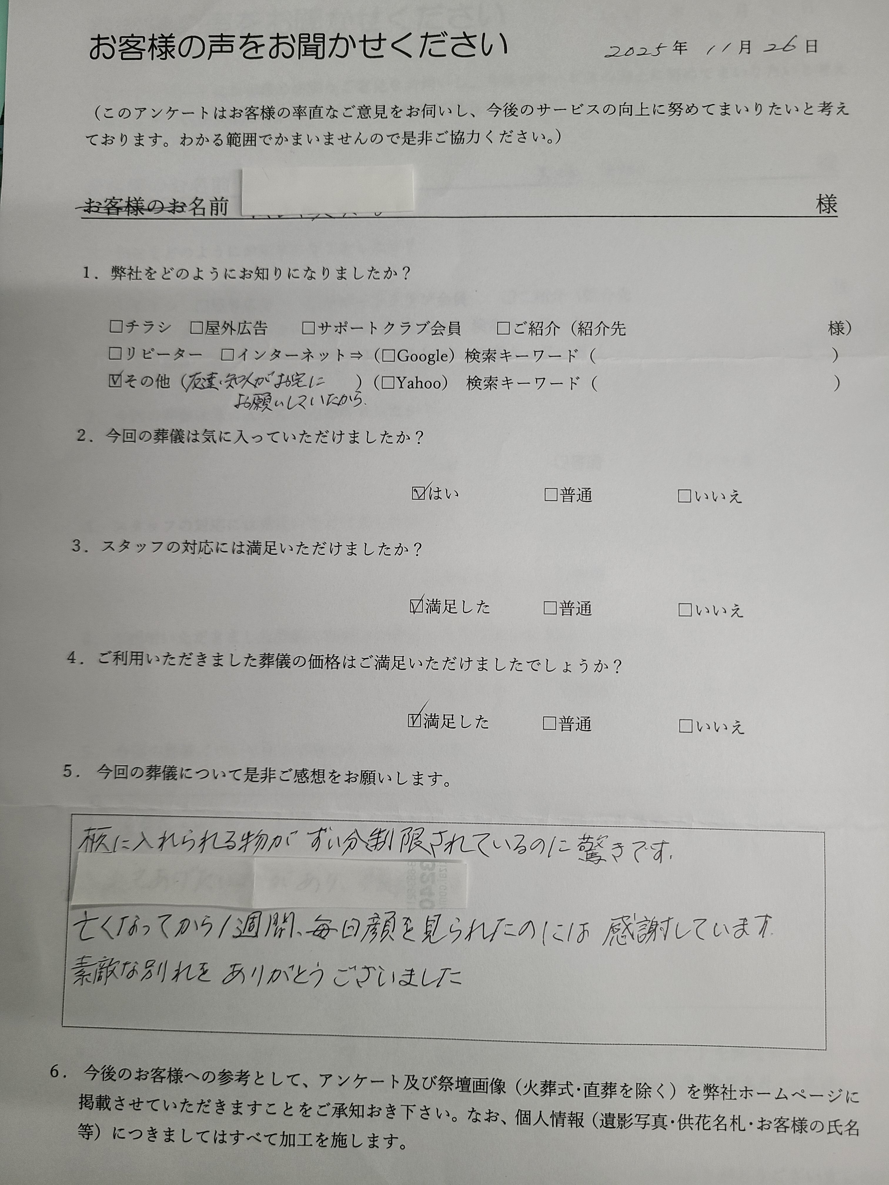 支援葬祭では、葬儀を終えられたご遺族の方にアンケートにご協力いただき、より良いサービスの提供に努めております。